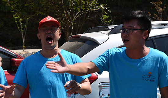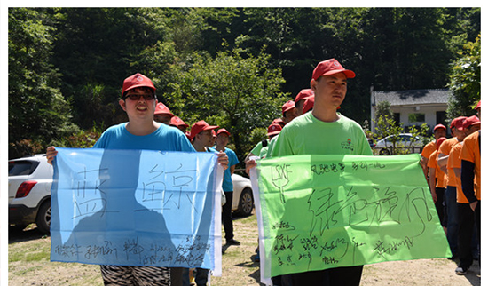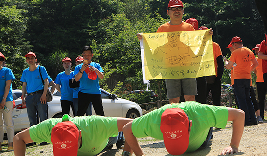好山好水觀不足,別忘了我們是來拓展的哈——教練開始布置第一個任務:團隊組建。紅藍橙綠四只隊伍要在短時間內想出各自的隊名、隊呼和隊歌,然后進行團隊展示。各組隊員立刻展開了激烈的頭腦風暴,有想法的表達出來,再由全體組員討論使之完善,充分展現(xiàn)了一個團隊的決策靈活性。在排練的時候,堅決服從隊長口令,又能體現(xiàn)出團隊的紀律性。最后呈現(xiàn)的四支隊伍分別是藍鯨隊、綠色旋風隊、大黃蜂隊和紅軍隊! 首輪展示,效果不佳,教練給予每隊隊長和政委20個俯臥撐作為懲罰。隊員在一旁默默心疼隊長,下定決心下輪好好發(fā)揮!果不其然,有過第一次的經驗之后,各組隊員重振旗鼓,全心投入,獲得了教練的一致好評!