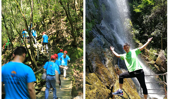接下來,旗手們舉著四色隊旗帶領著各自隊員,浩浩蕩蕩的來到了百丈崖林區(qū)。林區(qū)內有普通道和探險道兩種路線選擇。喜歡挑戰(zhàn)的隊員們都興高采烈地探險去了——獨木橋,鎖鏈橋,鋼絲懸,蕩繩,攀巖,花樣百出,刺激驚險。其他隊員選擇路程稍遠的普通道,小橋流水,樹影斑駁。雖然有樹林為大家遮擋了炎炎烈日,但奈何還是汗流浹背,氣喘吁吁;隊員們相互鼓氣加油,挑戰(zhàn)自己的體能極限。一個小時后,年輕力壯的后生們勝利到達終點百丈崖,各隊旗手紛紛登上百丈崖,揮舞著隊旗,留影紀念!苦盡甘來,午餐時間,大家都吃的格外的香。
