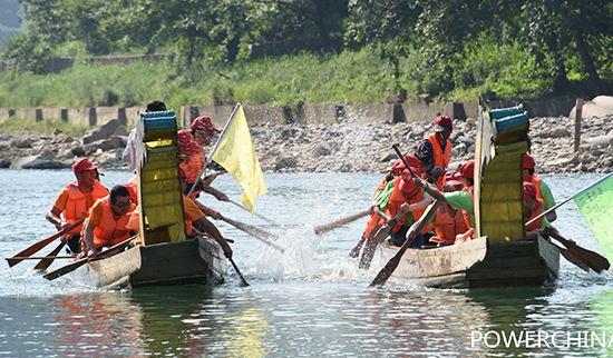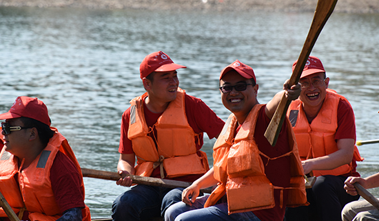 最后一項活動也是今天的壓軸項目--劃龍舟比賽。在端午節(jié)能夠體驗一下節(jié)日的傳統(tǒng),隊員們都期待不已。穿好救生衣,大家坐上了龍舟,摩拳擦掌,蓄勢待發(fā)。教練哨聲一響,隊員們都開始奮力劃槳,波光粼粼的秋浦河上激起了一道道水花,配合著鼓手激昂的鼓點,大家愈戰(zhàn)愈勇。返程時是逆流,大家明顯有些體力不支了,兩艘龍船不相上下,在快到達終點時,不知是誰開始用船槳潑水挑釁,劃龍舟比賽一下變成了潑水比賽,那場面好不歡快!一時間秋浦河上灑滿了長九人的歡聲笑語,身體的疲憊一掃而光。