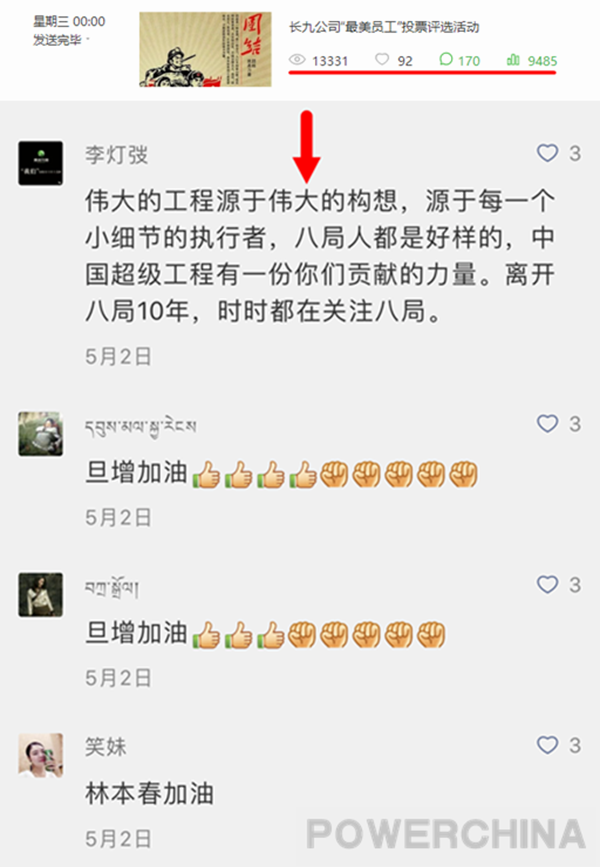 微信投票活動(dòng)還收到熱心留言170余條,這當(dāng)中不乏親朋好友們的支持,還有水電同行們從國(guó)外項(xiàng)目建設(shè)現(xiàn)場(chǎng)發(fā)來(lái)的聲援,足見(jiàn)咱們最美員工們的朋友遍四方,人脈有多廣。留言中更多的則是對(duì)長(zhǎng)九項(xiàng)目、長(zhǎng)九事業(yè)的美好祝福,有留言這樣寫(xiě)道:“偉大的工程源于偉大的構(gòu)想,也源于對(duì)細(xì)節(jié)的精益求精。長(zhǎng)九人都是好樣的,中國(guó)超級(jí)工程有你們貢獻(xiàn)的力量。”