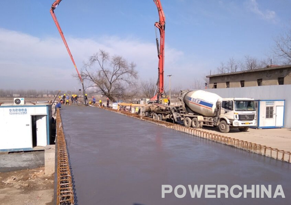 2號檢修棧橋長154.52米,寬5米。棧橋橋面層施工首先采用間距和直徑為10厘米的鋼筋綁扎成網(wǎng)片,來做為提高面層整體抗壓性能的關(guān)鍵保證;而后測量放線工作最為關(guān)鍵,沿棧橋縱向方向每隔1.2米橫向?qū)ΨQ布置2個鋼筋支架做為高程控制點,以保證面層高程的準(zhǔn)確性和平整度;最后采用C35強度等級的加纖維混凝土進行人工配合泵車澆筑,先經(jīng)人工找平,再用抹光機器反復(fù)壓光找平,從而完成了整項棧橋面層鋪裝澆筑工作。