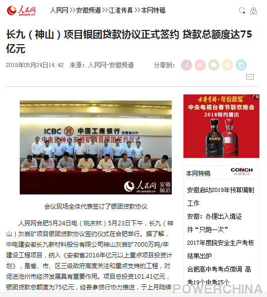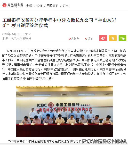 鳳凰網(wǎng)2018年5月25日報(bào)道《工商銀行安徽省分行舉行中電建安徽長九公司“神山灰?guī)r礦”項(xiàng)目銀團(tuán)簽約儀式》。