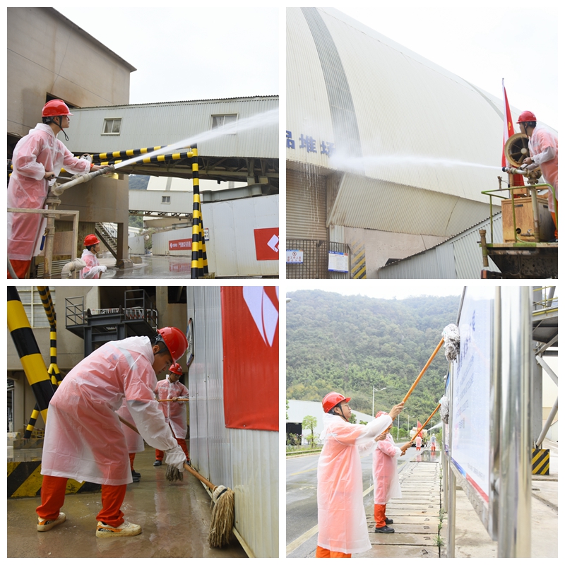 第二組的主要任務(wù)是清理從礦南路到長膠廊道的區(qū)域,指示牌、護欄、集裝箱板都是我們的任務(wù)目標。大家分頭行動,鼓足干勁,手中的拖把不放過任何一處細節(jié)。面對“高海拔”的料倉堆場大棚,我們及時請出了“特種車輛”——灑水車。小組成員分工明確,配合默契,有人充當(dāng)安全防護警戒的“眼”,有人負責(zé)擔(dān)任持穩(wěn)槍管、對準污泥的“手”。高壓水流從槍口不斷噴出,殘留在大棚之上的浮塵隨之而下。經(jīng)過一上午的奮斗,一路的棚面顯得格外干凈整潔。看著系統(tǒng)除去污垢后呈現(xiàn)的嶄新色彩,成就感與榮譽感也自然生在包括我在內(nèi)的每個突擊隊員心中。