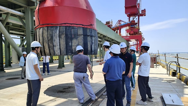 在烏沙港公用碼頭,觀摩團(tuán)詳細(xì)了解了碼頭概況和碼頭信息化公用服務(wù)平臺(tái),重點(diǎn)研究交流了3000噸級(jí)負(fù)壓收塵式裝船機(jī)的負(fù)壓收塵機(jī)構(gòu)及其工作原理。